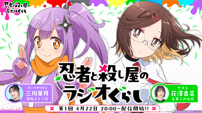 TVアニメ『忍者と殺し屋のふたりぐらし』公式WEBラジオ番組の配信が決定しました。草隠さとこ役の三川華月さんをメインパーソナリティに迎え、毎月22日(にんにんの日)に、豪華なゲストをおよびし作品の魅力をお届け。初回配信(4月22日)は古賀このは役の花澤香菜さんがゲスト出演します。