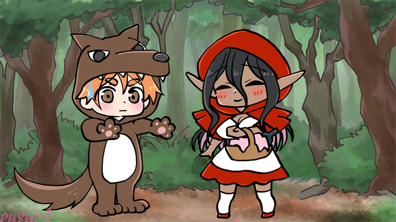 風邪を引いたおばあちゃん(サクラ)のお見舞いに出かけた赤ずきん(ベル)。その道中でおおかみ(日向)と出会ってしまう。