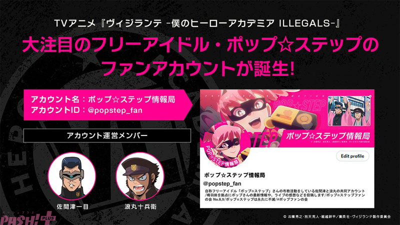 更に、自称フリーアイドルとして作中で活躍を見せているポップですが、第2話で登場したポップの熱狂的ファンである佐間津一目、浪丸十兵衛が運用するとされるポップのファンアカウント「ポップ☆ステップ情報局」の公式X(旧Twitter)が開設されました。同アカウントでは今後、「ポップ☆ステップ」の最新情報や、ライブレポート、まれに佐間津、浪丸の個人的なつぶやきも投稿予定となりますので、ぜひアニメ公式アカウントと合わせてお楽しみください!