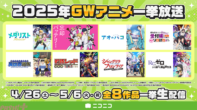 ドワンゴは、ライブ配信サービス「ニコニコ生放送」にて、2025年4月26日(土)~5月6日(火)のゴールデンウィーク(GW)期間中、青春・スポーツ・異世界などの人気ジャンルの注目作品を中心にセレクトした、アニメの無料一挙放送を実施します。