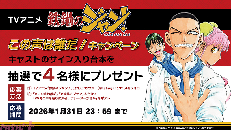TVアニメ『鉄鍋のジャン!』公式X(旧Twitter)をフォローし、「#この声は誰だ」「#鉄鍋のジャン」を付けて「PV内の声を頼りに声優、ナレーターが誰か」をポスト。正解した方の中から抽選で4名にキャストのサイン入り台本をプレゼントします。
