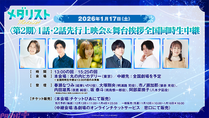 来年1月17日(土)にアニメ放送に先駆けて、『メダリスト』第2話までの先行上映と豪華キャストが登壇する舞台挨拶の実施が決定しています。全国劇場での同時中継も決まっている本イベントにて、アニメ描き下ろしのいのりと司が描かれた「ムキムキステッカー」を入場者特典として無料配布します。
