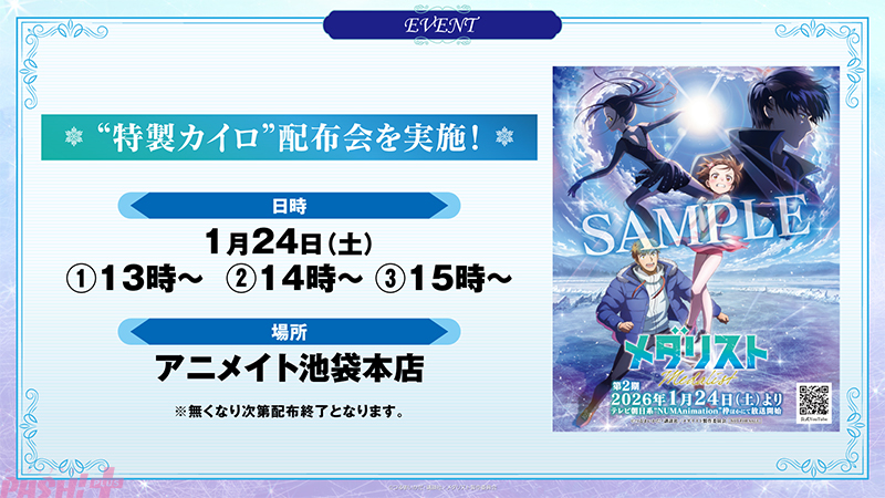 放送開始を記念して、1月24日(土)にアニメイト池袋本店で“特製カイロ”配布会の実施が決定。新しく発表となったキービジュアルを使用した“特製カイロ”を配布します。