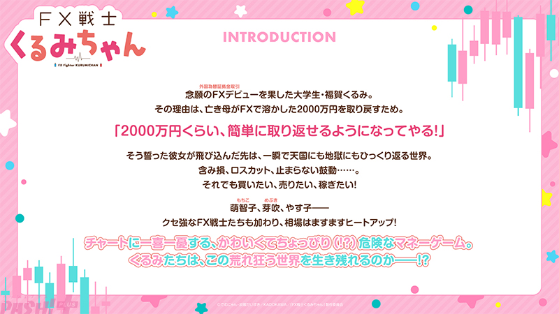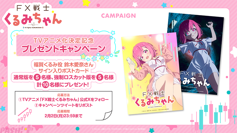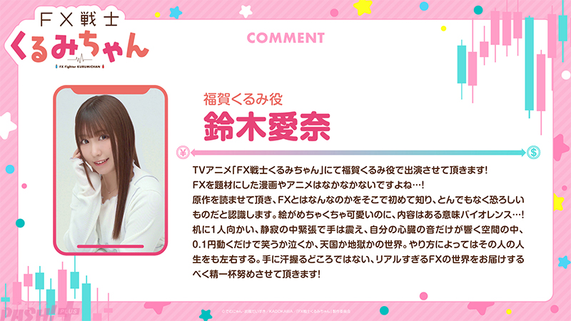 本作はほんわかゆるふわJDによる ちょっとアブナイ(!?)FXのおはなしです。2026年放送予定となっています。福賀くるみ役は鈴木愛奈さんに決定。ティザービジュアルとあわせて解禁となるティザーPVでは、福賀くるみのキャラクターボイスも初公開となっています。
