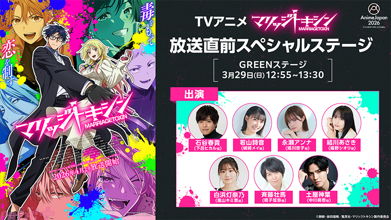 そして、2026年3月28日(土)・29日(日)に東京ビッグサイトにて開催されるAnimeJapan 2026内、3月29日(日)GREEN STAGEにて、TVアニメ『マリッジトキシン』放送直前スペシャルステージの実施が決定! ステージには石谷春貴さん・若山詩音さん・永瀬アンナさん・結川あさきさん・白浜灯奈乃さん・斉藤壮馬さん・土屋神葉さんの豪華キャストが集結。放送開始を直前に控えた本作の魅力をたっぷりとお届けします。
