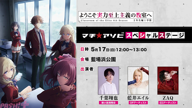 さらに「マチ★アソビvol.30」にて、千葉翔也さん(綾小路清隆役)、藍井エイル(さんオープニングアーティスト)、ZAQさん(エンディングアーティスト)出演のスペシャルステージの実施が決定。主題歌アーティストライブと作品トークをお届けします。