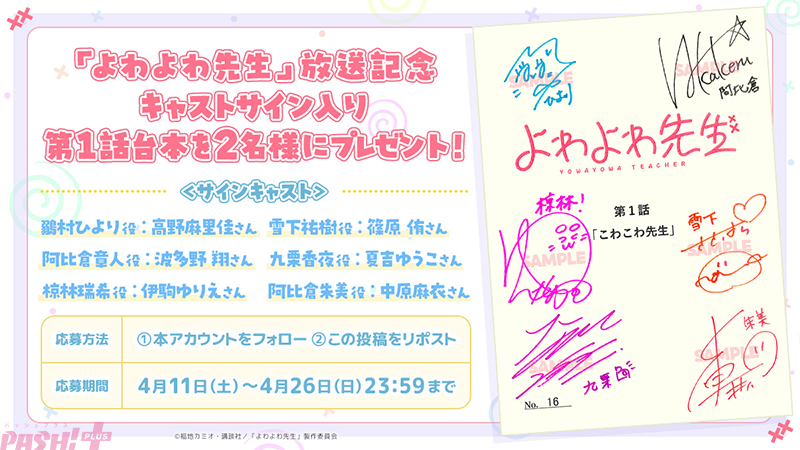 TVアニメ『よわよわ先生』の放送開始を記念して、キャストサイン入り第1話台本のプレゼントキャンペーンの開催が決定しました。