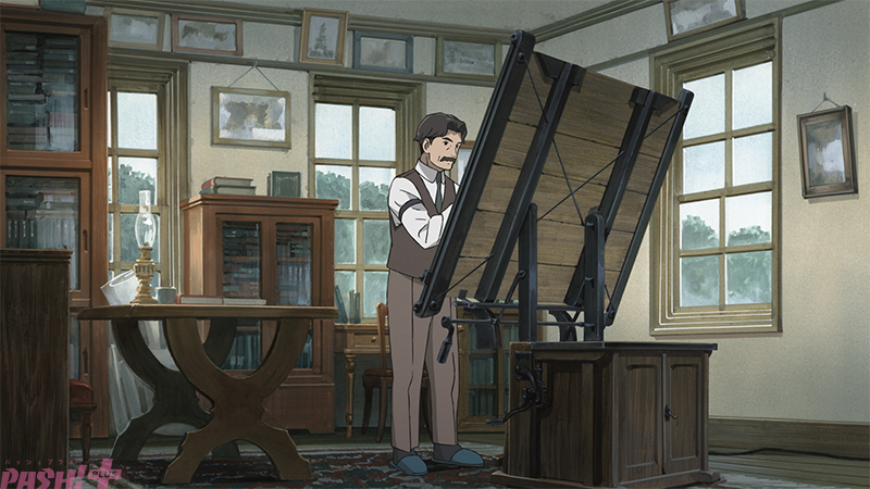 白土「園井家ですが、高田馬場の周辺と設定しました。明治の高田馬場は 1910年(明治43年)に鉄道院山手線「高田馬場駅」が開業したばかりで、落合崖線沿いには金持ちの別邸などもある自然を残した邸宅街。家のモデルは文豪・夏目漱石が晩年に住んだ邸宅で、特に園井父がいる部屋は、門下生が出入りしたとされる漱石の書斎「漱石山房」などを参考にしています。しかし、和室に洋式の家具が配置された和洋折衷的なレイアウトにするため、細かい部分は複数の幕末、明治の建築を組み合わせたものになっております」