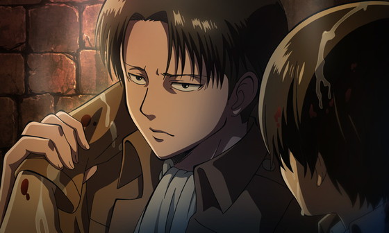 巨人との戦いで疲れ果て、巨人の返り血やよだれでドロドロになったプレイヤーに、肩を貸してくれるリヴァイ兵長。