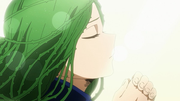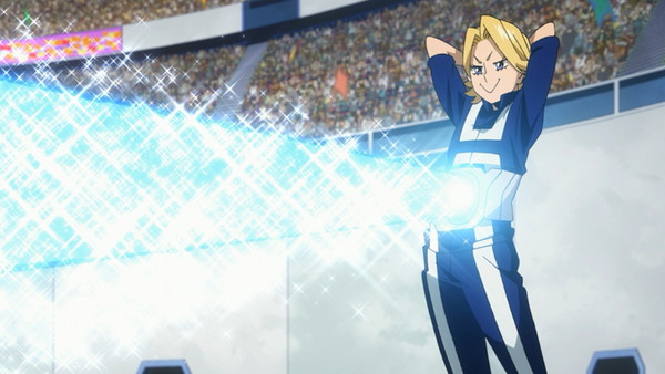 強力な電気を発する“帯”の個性を持つ上鳴電気(声優:畠中 祐)は、トゲ状の髪を操る“ツル”の個性を持つ・塩崎茨(声優:真坂美帆)と対戦。驚異的なスピードで走る“エンジン”が個性の飯田天哉(声優:石川界人)は、さまざまなアイテムを発明する発目明(声優:桜 あず)と激突。