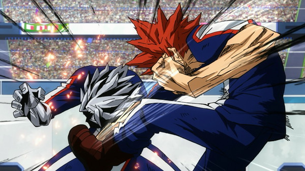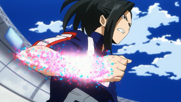 “黒影”の個性を持つ常闇踏陰(声優:細谷佳正)は“創造”が個性の八百万百と、おへそからレーザーを発射する青山優雅は“酸”の個性を持つ芦戸三奈と、お互いに全身をガチガチに硬くする個性を持つ、“硬化”の切島鋭児郎は“スティール”の鉄哲徹撤と対戦する。