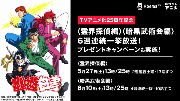 AbemaTV(アベマティーヴィー)の“なつかしアニメチャンネル”で、『幽☆遊☆白書』の6週連続一挙放送が決定した。5月27日13時より2週にわたり“霊界探偵編”、6月10日13時より4週にわたり“暗黒武術会編”が放送される。