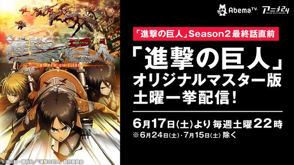 AbemaTV(アベマティーヴィー)の“アニメ24チャンネル”で、『進撃の巨人』のオリジナルマスター版が全4回にわたり全話一挙配信される。