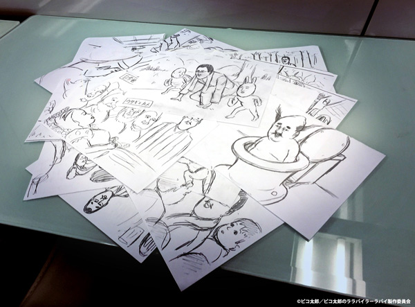 あと、アニメってすごい手間暇がかかるじゃないですか。それで手失敗すると、みんながとても苦しむので、あまり手間がかからないやつがいいなと。そこで、そんなに動かない紙芝居方式を思いつきました。セリフに関しては、本当にその場の思いつきを、谷口さんの目で編集してもらうのがいいのかなということで、谷口さんに一枚の絵だけ描いてきてもらって、それを収録ブースの中で勝手にストーリーを作って終わり。編集の際には間とかを潰すんですけど、そうじゃなくて“センテンス”を潰しちゃえって。もうワンセンテンスだけでいいんじゃないかと。この中で一番面白いやつだけをポンって入れて、あとはもう捨てる。いわば“断捨離アニメ”ですね。僕は“ピコ太郎の頭の中のシャトーブリアン”って呼んでいます。