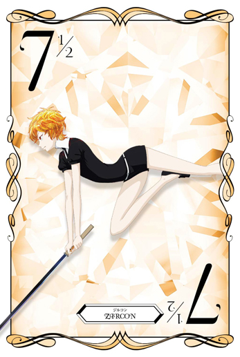 ジルコンは、明るいオレンジのショートヘアが特徴。硬度は七半で、主人公・フォスの次に若い宝石。真面目な優等生で、イエローダイアモンドと戦闘のペアを組んでいる。