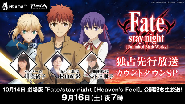 AbemaTV内の「アニメ 24 チャンネル」にて、TV アニメ『Fate/stay night [Unlimited Blade Works]』が3週連続で独占先行一挙放送されることが決定した。さらに初日となる9月16日(土)の夜7時より、杉山紀彰らキャスト陣が出演するカウントダウンSP特別生放送も放送される。