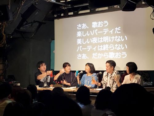 MCより呼び込まれ登壇したスタッフ陣から一言ずつ挨拶が述べられ、吉村監督から「皆さん一緒にこの曲を歌いましょう!」との掛け声で劇中歌『夜は明けない』が会場内に流れだし、広報部会員の皆さん(観客)との大合唱が始まり会場が一体感に包まれた。大合唱が終わると吉村監督の発声で全員での乾杯とともにトークショーがスタート。