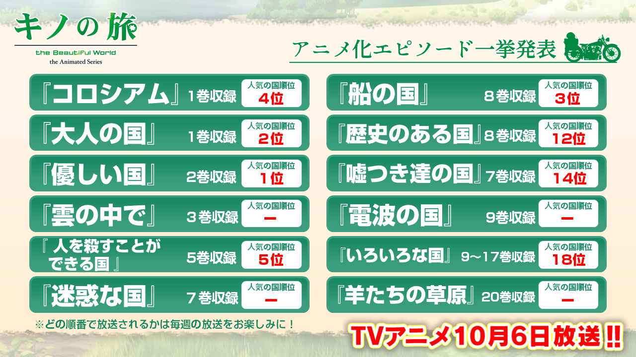 ▲『キノの旅 –the Beautiful World- the Animated Series』でのアニメ化エピソード一覧。2015年に15周年を記念して行われた人気投票の結果を元にアニメスタッフとの話し合いを行い1巻~20巻までのエピソードを幅広くピックアップした。