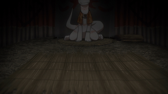 シャースーリューから許可を得たザリュースは、無事に同盟関係を結んで帰ってくることを誓い、相棒のヒドラ・ロロロとともに《朱の瞳(レッド・アイ)》族の村へと向かう。