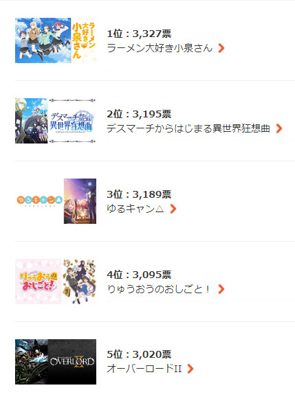 1月26日~2月2日12時の期間に集まった票数は55,378票! “総合ランキング”では、1位に『ラーメン大好き小泉さん』が3,327票を獲得してランクイン。“性別ランキング”では、男性1位が同じく『ラーメン大好き小泉さん』、女性1位は『学園ベビーシッターズ』となった。