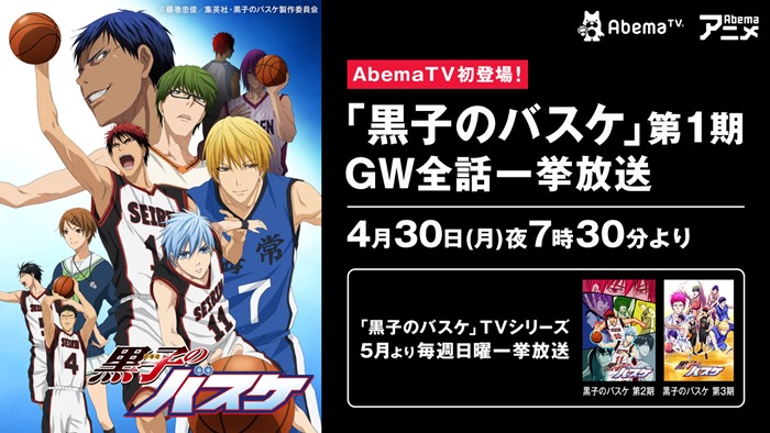 AbemaTVの“Abemaアニメチャンネル”にて、TVアニメ『黒子のバスケ』第1期一挙放送がゴールデンウイークに6夜連続で行われる。