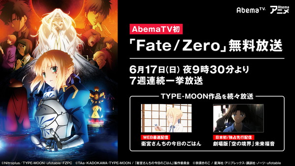 『Fate/Zero』が6月17日よりAbemaTVにて初となる7週連続で全話無料一挙放送されることが決定した。また、本放送に合わせ、TYPE-MOON作品も続々放送される。