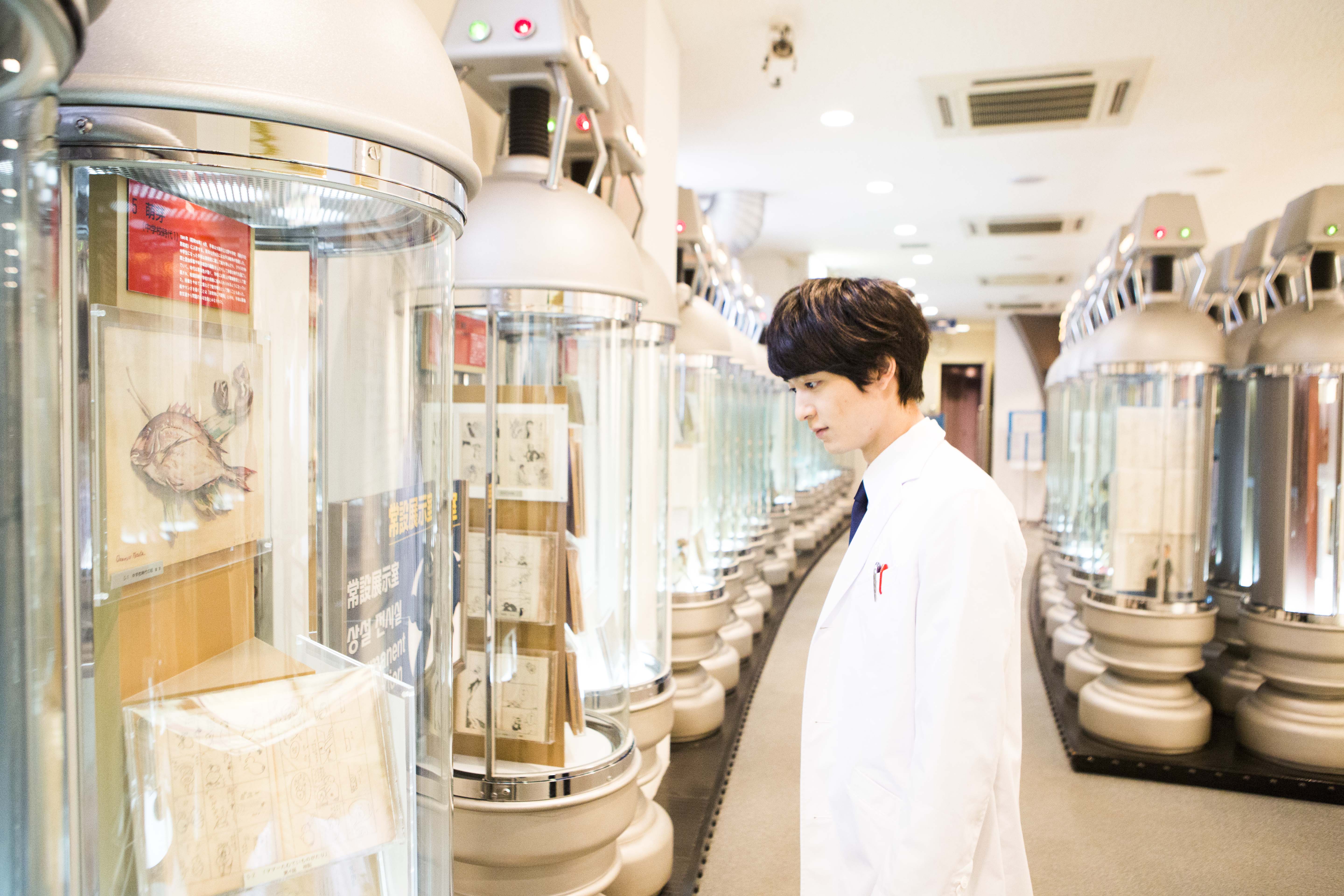 今回初めて記念館を訪れたという梅原裕一郎は、各コーナーごとに興味深げに展示物を見学。なかでも今回訪問した最大の目的である『ヤング ブラック・ジャック』の企画展(2016年2月21日まで開催)のブースでは、一つ一つの展示物を真剣に見つめていた。