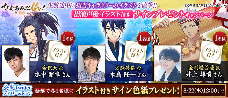 直筆イラスト付きサイン色紙プレゼント対象キャスト:帝釈天役・水中雅章、文殊菩薩役・木島隆一、金剛燈菩薩役・井上雄貴 r 開催期間:8月22日12:00まで