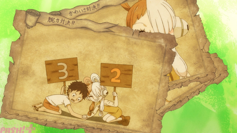 “身長対決”から“パンチ対決”までさまざまな戦いをするが、ルフィはどれも勝つことが出来ない。対決に疲れて休んでいると、ふたりの前にヒグマの手下の男たちが現れる。