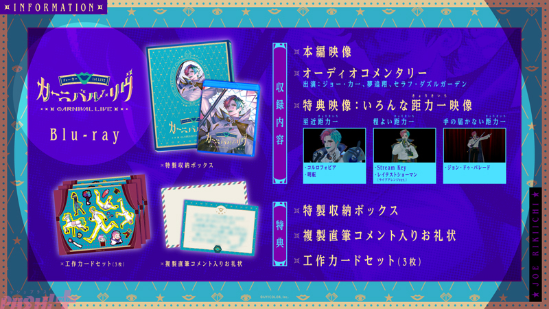 ANYCOLORが運営するVTuber/バーチャルライバーグループ「にじさんじ」は、『ジョー・力一 1st LIVE「カーニバル・リヴ」』Blu-rayの店舗別特典画像に加え、商品紹介PVの情報を発表しました。