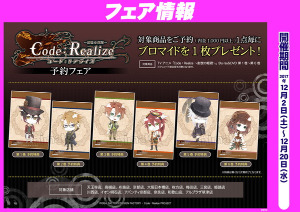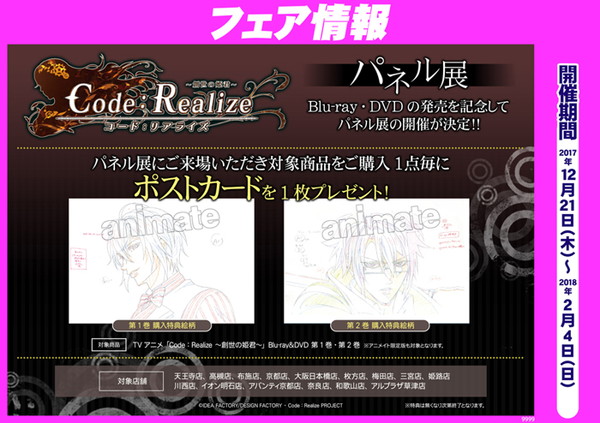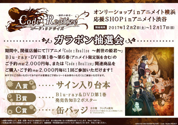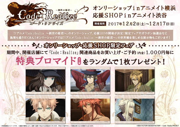 TVアニメ『Code:Realize ~創世の姫君~』のオンリーショップ(アニメイト横浜)&応援SHOP(アニメイト渋谷)が開催中だ。