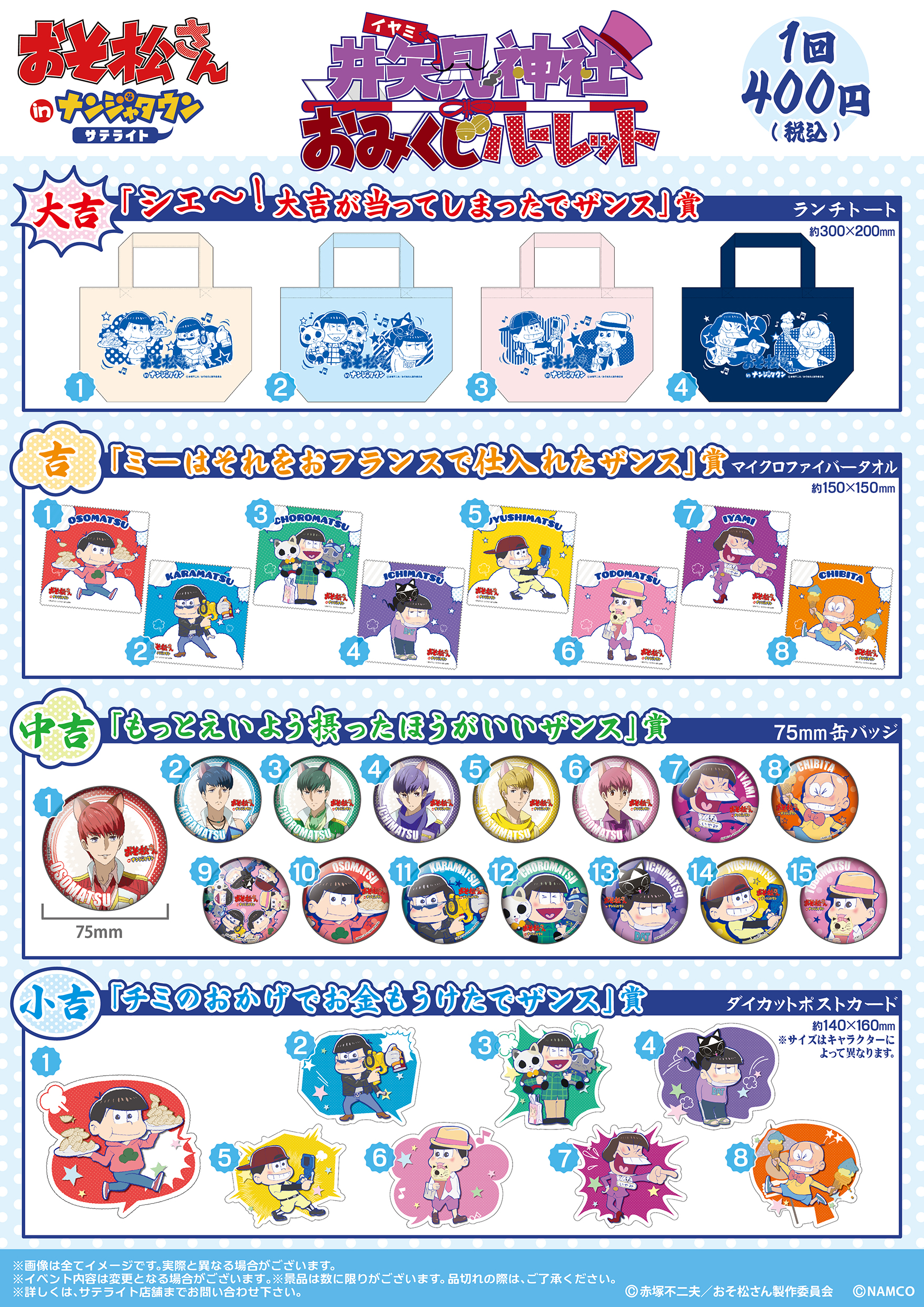 ナンジャタウンで『おそ松さん』のイベントをやると聞きつけたイヤミが、荒稼ぎをしようとおみくじ屋台をオープン! イヤミの録り下ろしボイスで接客する屋台は、破魔矢がモチーフになったルーレツ卜を回し、出た目の景品がハズレなしでもらえる。