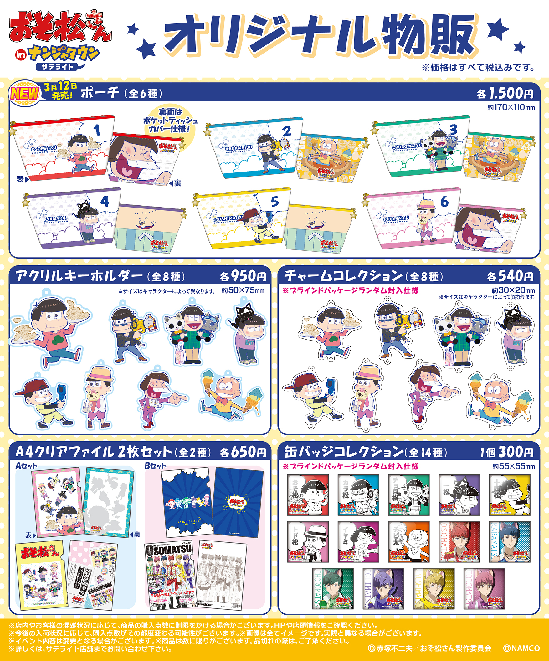 ナンジャタウンでしか手に入らないイベント限定オリジナル商品に加えて、一般流通商品を販売。また、3月12日(土)よりポーチ(6種)を追加販売。