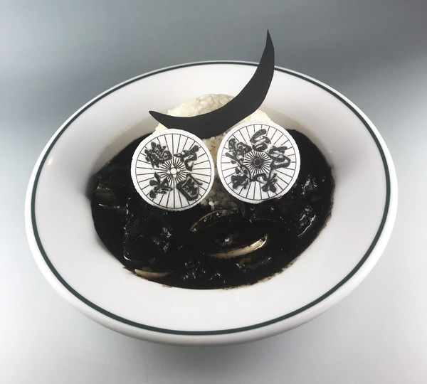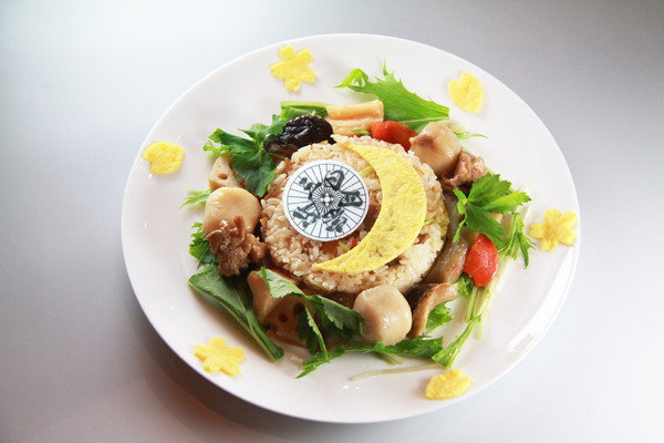 円環をめぐる三日月と、三日月を取り巻く刀剣男子達をイメージ。出汁が染み込んだ具沢山な五目御飯。