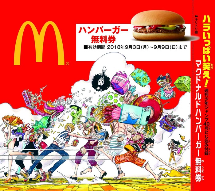 コラボ企画は大きく2つ。1つ目の企画は、9月3日(月)発売の『週刊少年ジャンプ』40号に、マクドナルドの“ハンバーガー”無料券が付録として1枚付いており、9月9日(日)までの期間中に全国のマクドナルド店舗に持って行くと“ハンバーガー”1個と交換できるという、お得なコラボとなっている。
