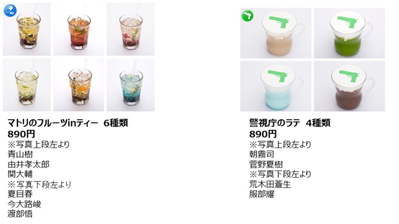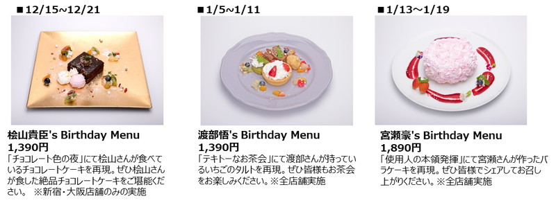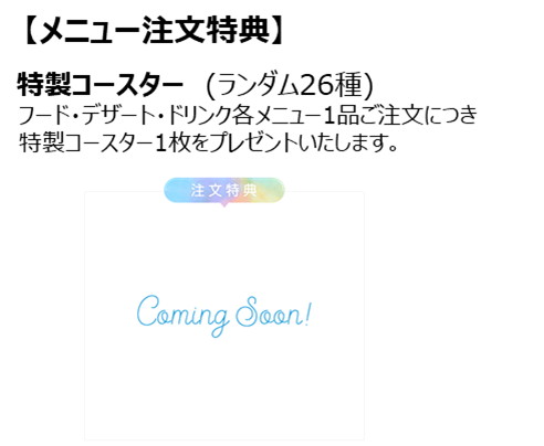 また、フード・デザート・ドリンク各メニュー1品注文につき、注文特典として特製コースター(全26種ランダム)1枚がもらえる。さらに期間中に誕生日を迎える桧山貴臣、渡部 悟、宮瀬 豪の3名をお祝いするメニューも期間限定で登場する。