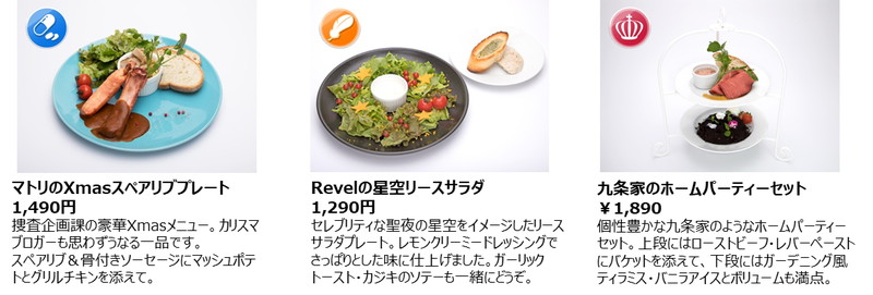 店内では、 クリスマスをテーマにした前半メニュー<フード(3種類)やデザート(3種類)>、冬のデートをテーマにした後半メニュー<フード(3種類)やデザート(3種類)>が販売される。フードとデザートはそれぞれの所属をイメージし、パーティーに相応しいリッチなスタイルになっており、ドリンクは通期で26キャラクター全員分が用意されている。