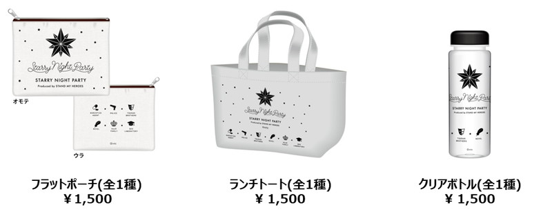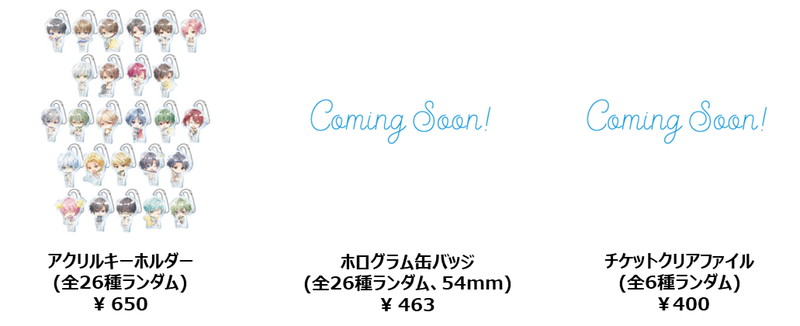 本パーティーのために描き起こされた冬のデートverミニキャラのアクリルキーホルダー・チケットクリアファイル、カフェオリジナルロゴを使用したクリアボトルや、 “Starry Night”をモチーフにしたキラキラのホログラム缶バッジなど多数のグッズが販売される。