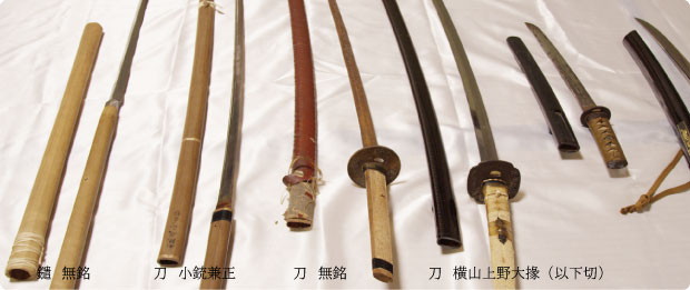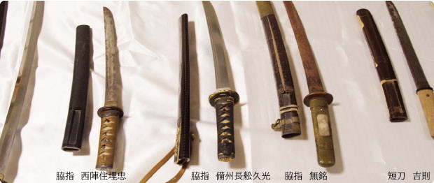 展示刀剣:脇指 西陣住埋忠、短刀 吉則、脇指 備州長舩久光、刀 横山上野大掾