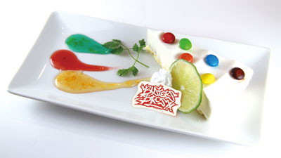 ・ブクロ最強のレアチーズケーキ <レアチーズケーキ+カラーチョコ+ライム+ ホイップクリーム+セルフィーユ +オレンジソース(青/オレンジ)+ ストロベリーソース> 〈価格〉 1,300円(税込)
