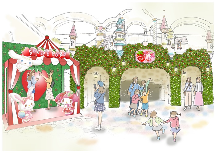 また、大きないちごのフォトスポットが登場するほか、“マイメロディのストロベリーショートケーキ”などいちごづくしの新作スイーツも期間限定で販売。さらに、いちごの衣装を着たキャラクターたちとの“ストロベリーキャラクターグリーティング”やバレンタイン&ホワイトデーにちなんだスペシャルイベント“スペシャルスイーツグリーティング”(有料)も見逃せない。