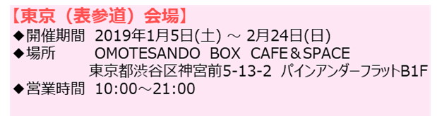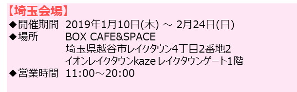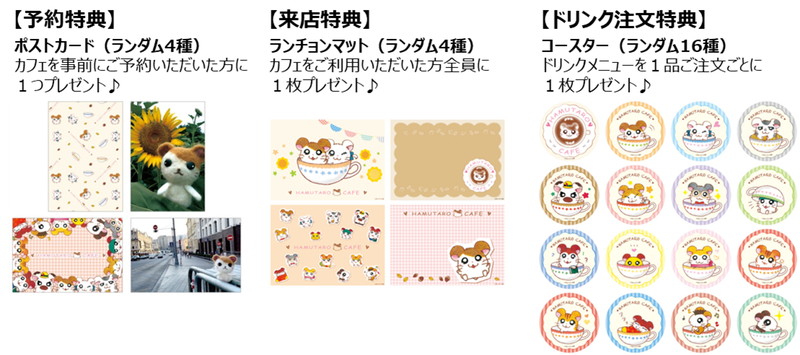 東京・表参道は事前予約制(埼玉は予約制なし)。 事前予約するとオリジナルポストカード(全4種のうちランダムで1枚)がもれなくもらえる。そのほか来店特典としてオリジナルランチョンマット(全4種のうちランダムで1枚)、またドリンクを注文するとオリジナルコースター(全16種のうちランダムで1枚)がもらえる。