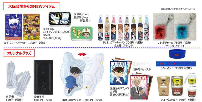 大阪会場では“光るICカードステッカー”や大人気“キラキラ缶ミントタブレットレモン風味”の服部平次・怪盗キッドバージョンをはじめ、青山剛昌さん描き下ろしの“複製ミニサイン色紙”付きガイドブック、白手袋や捜査手帳など本展オリジナルアイテムが多数会場に登場する。