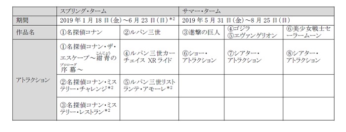 ※2『名探偵コナン』の“2名探偵コナン・ミステリー・チャレンジ”と“3名探偵コナン・ミステリー・レストラン”および『ルパン三世』の“5ルパン三世リストランテ・アモーレ”は、5月26日(日)までの開催。