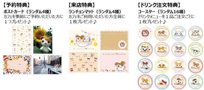 大阪・阿倍野は事前予約制。事前予約をすると“オリジナルポストカード(全4種のうちランダムで1枚)”がもらえる。そのほか来店特典に“オリジナルランチョンマット(全4種のうちランダムで1枚)”、ドリンクを注文で“オリジナルコースター(全16種のうちランダムで1枚)”も手に入る。