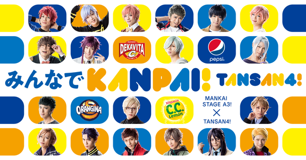 ここからさらに進化していくMANKAI STAGE『A3!』。素晴らしい公演に、貰った感動に、そしてみんなの未来に乾杯を。 サントリーブランドの炭酸飲料、ペプシ・デカビタC ・C.C.レモン・オランジーナ、以上4商品の総称「TANSAN4!」(たんさんふぉー)とし、MANKAI STAGE 『A3!』のコラボレーションが実現しました。