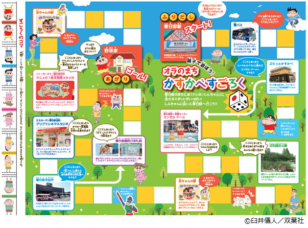 その他、春日部市の『クレヨンしんちゃん』に会えるスポットをまとめたすごろくも収録。すごろくで遊ぶだけでなく、春日部に遊びに来る時のマップとしても使える。
