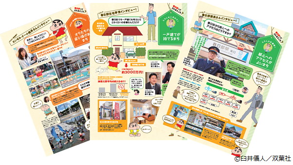 誌面では野原一家をはじめとしたクレヨンしんちゃんのキャラクターたちが全ページに登場して、市の魅力を伝えている。他にも『クレヨンしんちゃん』の描き下ろし漫画、ぬりえやめいろ、すごろく等、親子で楽しめるコンテンツも盛りだくさんだ。