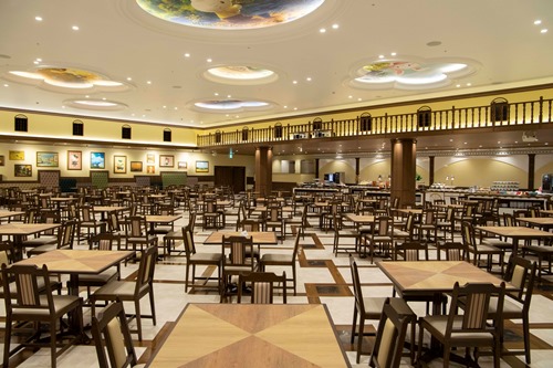 館のレストランでは目玉である肉料理をはじめ、約40種類のメニューの中から好きなものをビュッフェ形式で楽しめるレストランになっている。当日ビュッフェでは、特製ローストチキンや本格ローストポーク、自家製牛タンシチューなどのお肉料理、サラダやシェフおすすめの至福のアップルパイなどのスイーツなどが振舞われた。