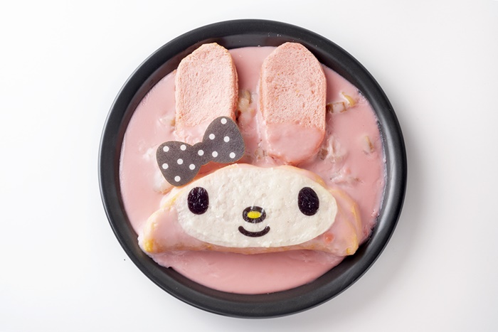 お料理はEGG&SPUMAで大人気ふわふわのスフレオムレツを使った“マイメロディのキュートなオム♡シチュー”やたっぷりのいちごにコーヒーゼリーがアクセントな“クロミのお気に入りパフェ”、クロミ・マイメロディ・ピアノが顔をのぞかせたドリンクなど、色合いも大人かわいいメニューがいっぱい。